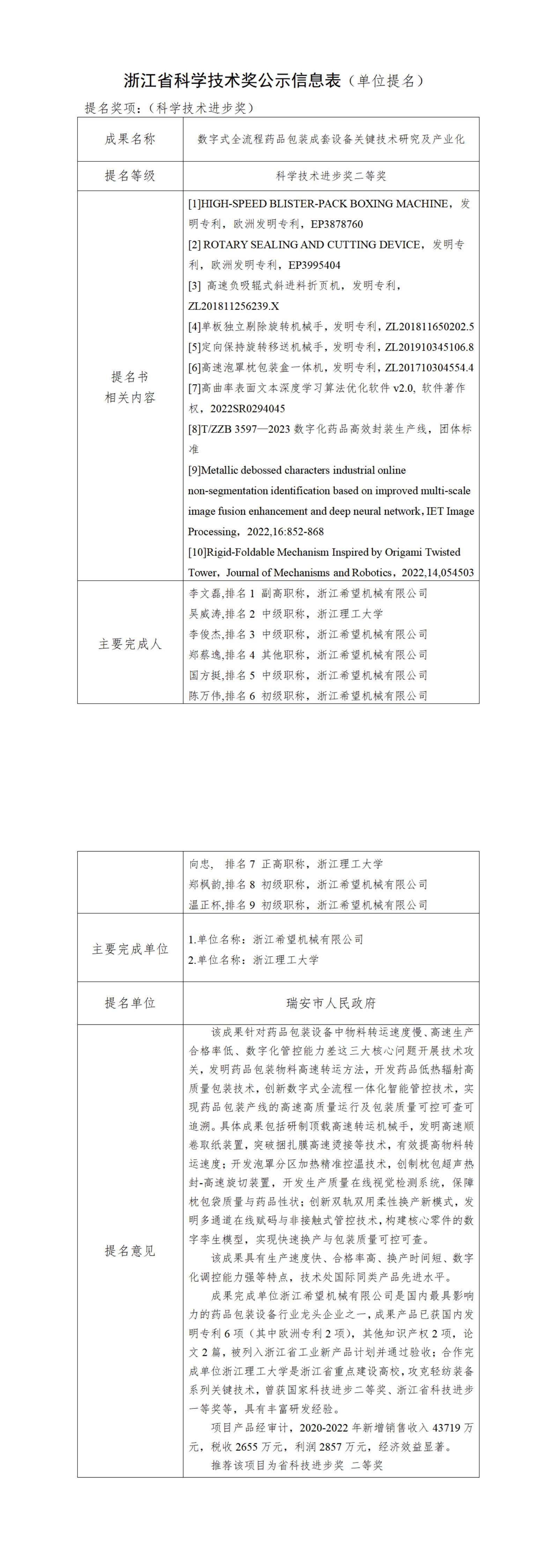 我公司“數(shù)字式全流程藥品包裝成套設(shè)備關(guān)鍵技術(shù)研究及產(chǎn)業(yè)化”項(xiàng)目研制開發(fā)成功后,獲得了較好的經(jīng)濟(jì)效益和社會效益,符合申報(bào)2023年度浙江省科學(xué)技術(shù)獎申報(bào)條件,根據(jù)浙江省科學(xué)技術(shù)廳《關(guān)于開展2023年度浙江省科學(xué)技術(shù)獎提名工作的通知》及《浙江省科學(xué)技術(shù)獎勵(lì)辦法》等規(guī)定要求,對本項(xiàng)目相關(guān)內(nèi)容進(jìn)行公示,公示時(shí)間從2024年8月19日開始至2024年8月25日結(jié)束,如對公示內(nèi)容有異議,可在公示期內(nèi)向公司總經(jīng)辦反映。
